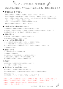 グッズ交換会、当方一人で諸々とやっておりますので、今の形が最善です。